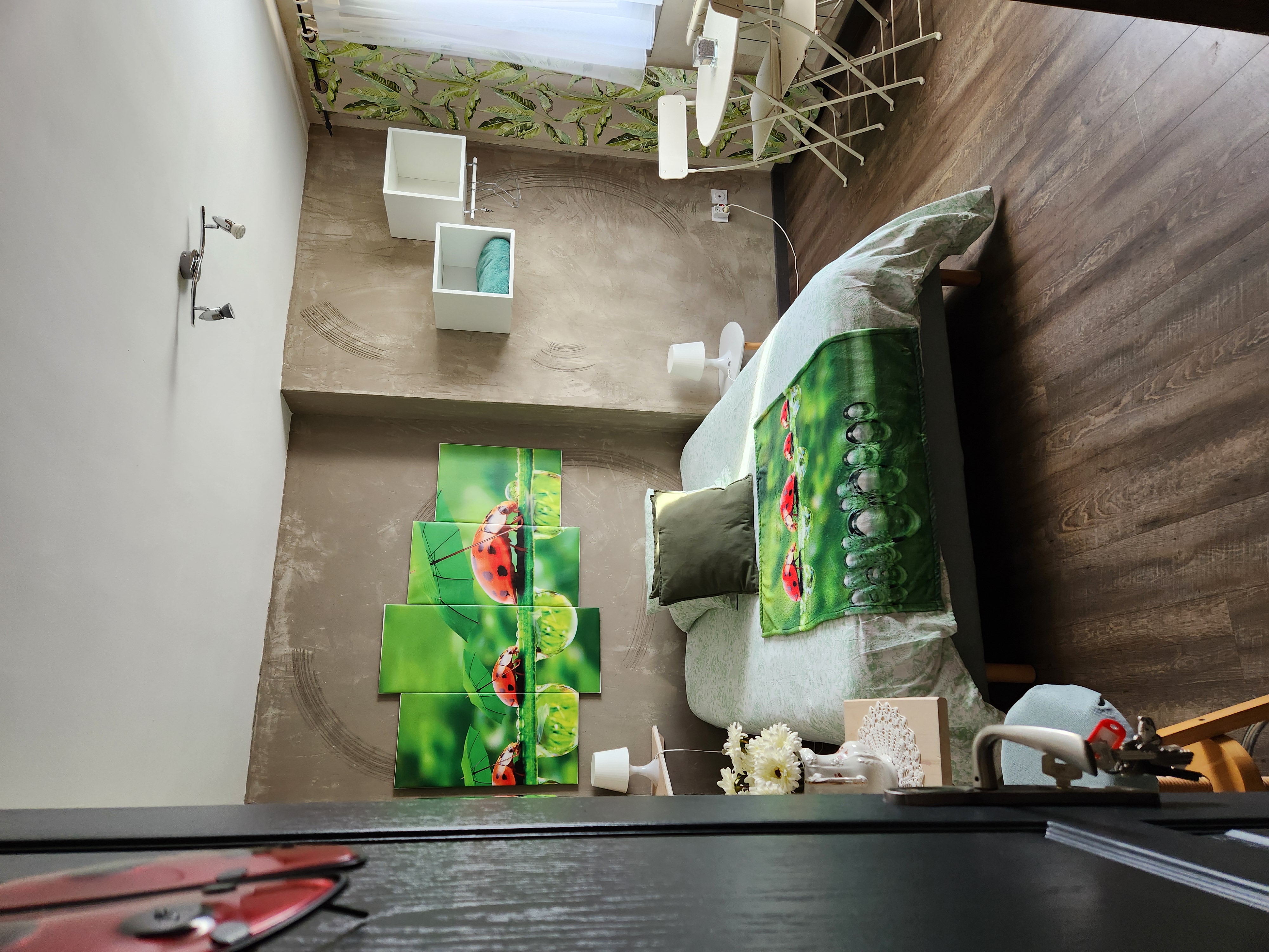 Cette chambre est la plus petite de nos 5 chambres et dispose d’un déco dans les tons de vert. Nous l’avons appelé coccinelle car nous y avons trouvé cet hiver un nid de coccinelles entre le volet et la fenêtre de la chambre….